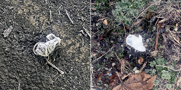 Two condoms along the same stretch of road. They were frozen which, hopefully, happened after the fact. Or act. Doing the math, we picked up a total of 196 hands. We feel we deserve a hand for that. Another one.