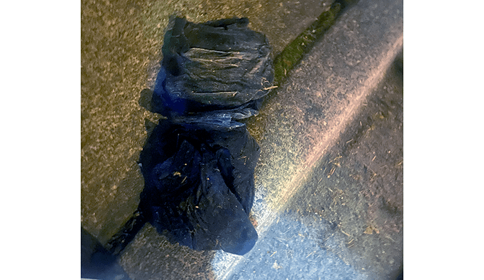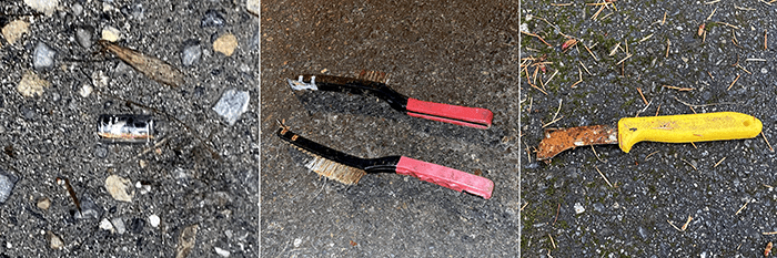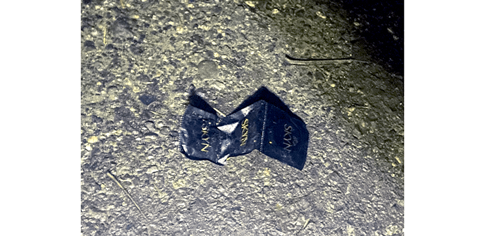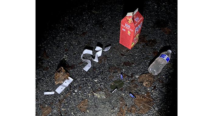 Some scraps of food wrappers, three AAA batteries and an empty Passion Orange Guava container. Oh, and yes, another urine bottle. Well, what do you expect after drinking a half-gallon of Passion Orange Guava juice. So, what does “passion” have to do with juice? We didn’t find any condoms nearby. There are the batteries, perhaps a vibrator was involved.