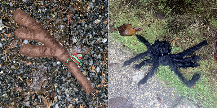 A reindeer car antler and one of those giant spiders from Australia. Or it may have been a fake, but either way it was creepy carrying it in our recycle bag most of our walk.