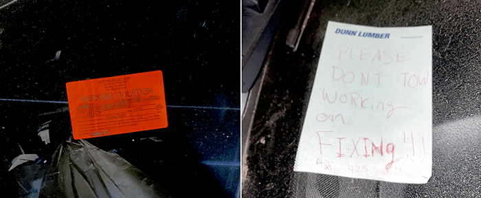 Then a note appeared on the dashboard. This is the type of drama we face every day at TrashWalking. We can’t wait for the next chapter. Will it get towed or get fixed?