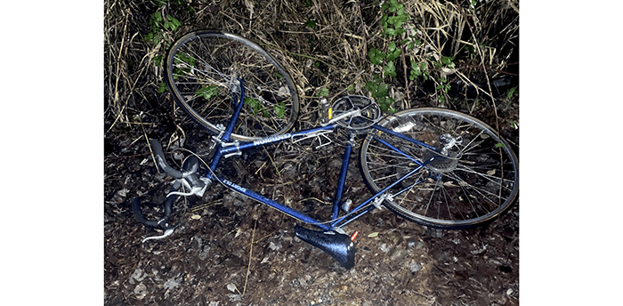 An abandoned bicycle across from the apartments on Woodinville Drive, near the large motorhome.