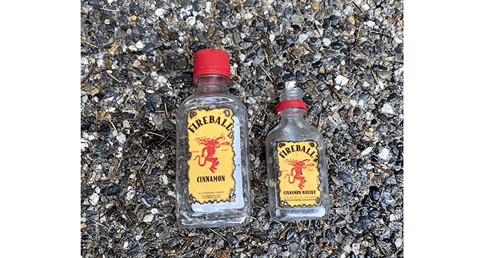 Yes, we know they are different sizes, but check the label. One is labeled “CINNAMON” and the other “CINNAMON WHISKY.” The one on the left is nonalcoholic but looks just like the alcoholic one. “I dunno, Zeke. You’d think after eight bottles we’d feel some kind of buzz.”