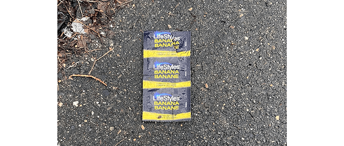 - 3 Condom wrappers, banana flavored.