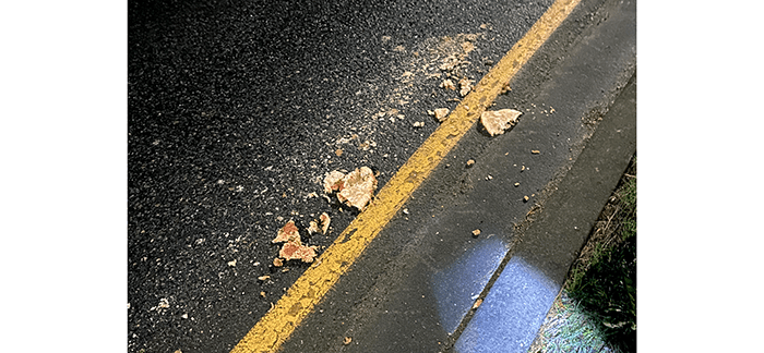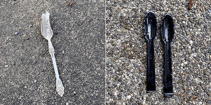 Another spoon. This one had been run over, so it was difficult to tell which way it was pointing. Then we picked up a matching pair of spoons that appeared undamaged until we realized they were a pair of tongs. Maybe a guy went after someone with a spoon and tongs. And perhaps the other guy had a hammer and tongs. It could explain the damage.
