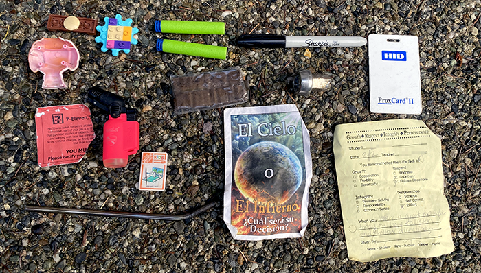 A Sharpie pen, an unopened cellophane bag with some cardboard in it. We opened it and it contained a soggy piece of cardboard. Go figure. A lock cylinder that had been drilled out and another lost key card.