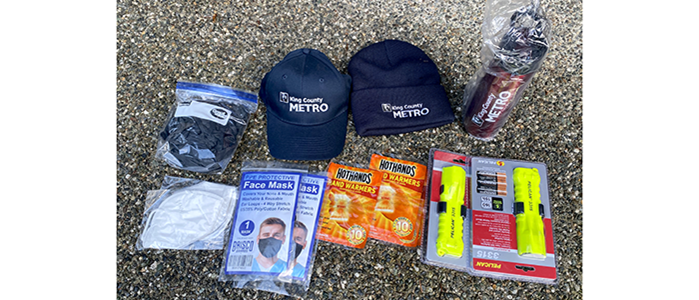Rubber gloves, two King County Metro hats, a Metro cup, some masks, hand warmers and two flashlights. We sometimes receive gift cards, and we appreciate them too, but this is something that someone took the effort to put together for us. This made our week and will be one of the best memories we will keep from our TrashWalking days.