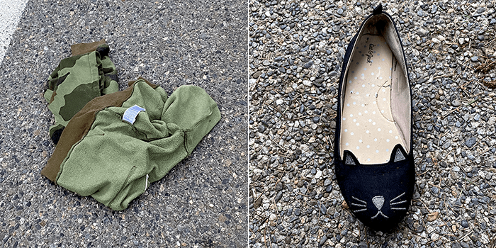 Someone dumped their pizza on the street including the pizza box. We tossed most of it, but we left the crust. We learned this from our grandkids.