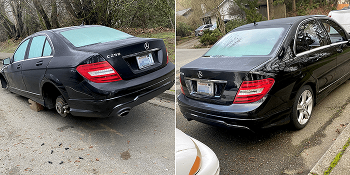The Mercedes along 112th Ave. NE that had its wheels stolen got fixed.