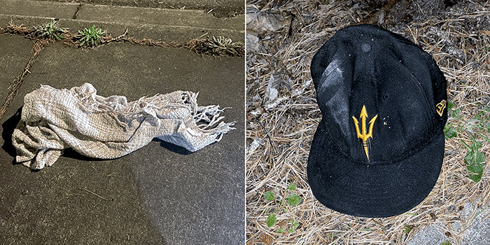 A nice wool shawl that will end up at Goodwill. That is, unless Janet takes a liking to it. Then we found a hat with the Arizona Sun Devils logo. The hat will go in our TrashWalking Museum, hat wing.