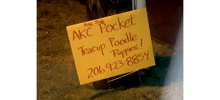 This is the first one we have seen so far this year, but we have seen these before for different kinds of dogs. We looked up the number on the Internet and it shows up mostly on obvious phishing sites. Caveat Emptor. Our overall interpretation: Don’t buy puppies from road signs.