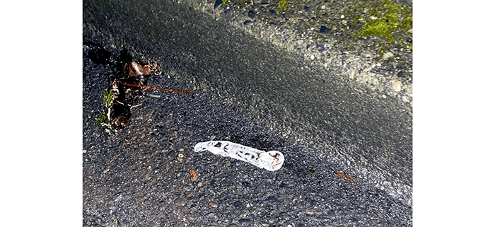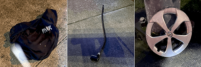 On our way back on the other side of the street, we saw some car parts in the park-and-ride turn lane.