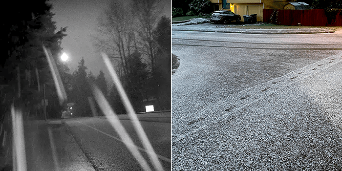 This morning was cold at 32°F (0°C) and clear with a large crescent moon on the horizon. Then, suddenly it started to snow.
