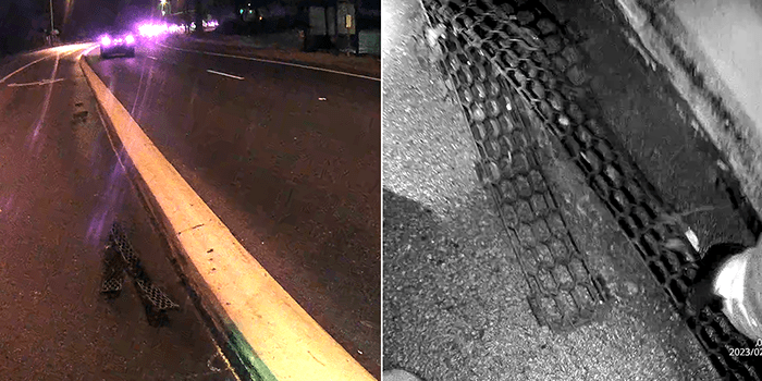 On the road down to Riverside Drive, some vehicle destroyed a drain cover.
