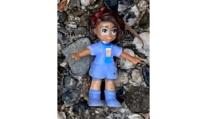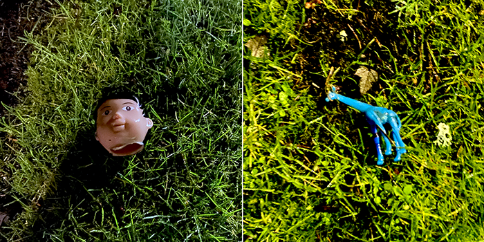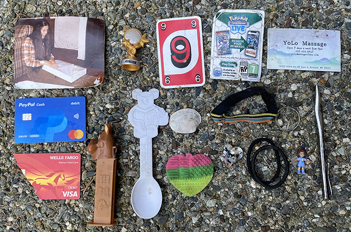 A Scooby Doo PEZ dispenser, empty. A spoon labeled “Hooked on Books and Froyo.” One number nine UNO Card. Or is it a six? No wonder they tossed the card. A seashell, a brightly-colored heart and a cleverly-camouflaged heart next to it.