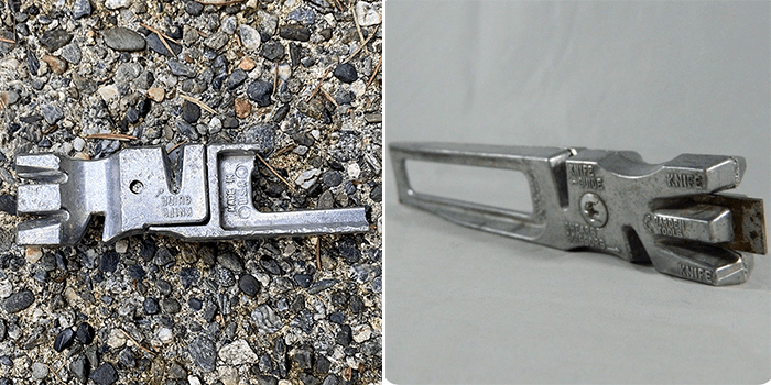 Well, part of a tool. It took a while and a lot of help from Google to determine what it was. We found one on eBay and is called a Vintage Knife, Scissors and Garden Tool Sharpener. We don’t know exactly how old it is, but anything on eBay that is more than ten years old is called “vintage” and the price goes up.