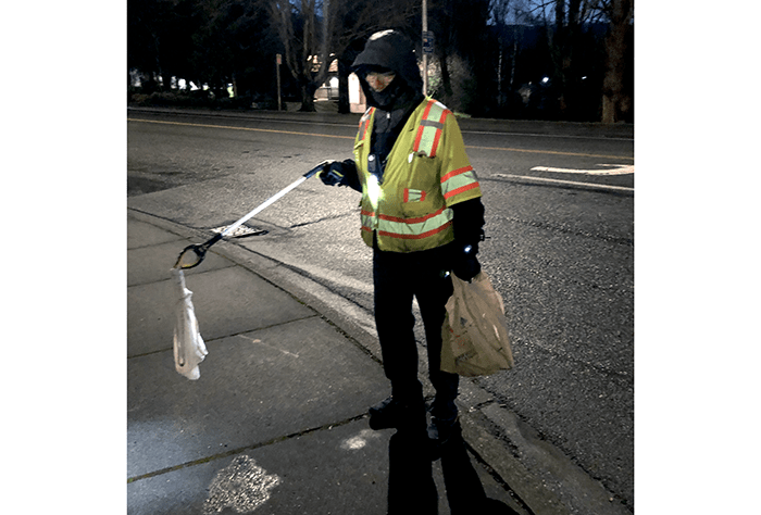 The yellow oil jug was full of oil and Chuck tried a few times to toss it up the bank. Finally, he got it to stay at a place where so he could reach it from the top. When all the parts were at the top, Chuck gathered everything into a pile and Janet started after the oil jug with her picker. Just as Chuck said, “I’ll get that”, the jug slide back down the hill.