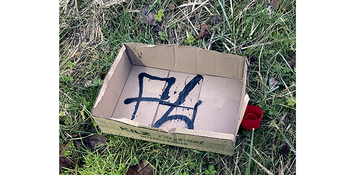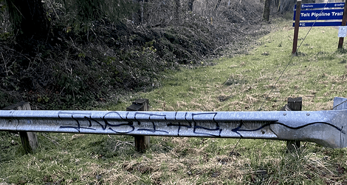 At the top of the Tolt Pipeline, we found a paint can top and cardboard box with a symbol painted in it.