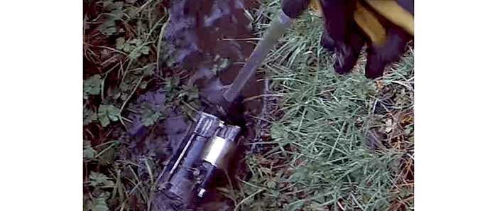 Chuck tried several attempts at coaxing the motor up the bank, but it was too heavy for the picker and it kept sliding back down into the water. Finally, Chuck got down on one knee and pulled it out by hand. Then getting up, he lost his balance and fell back into the ditch.