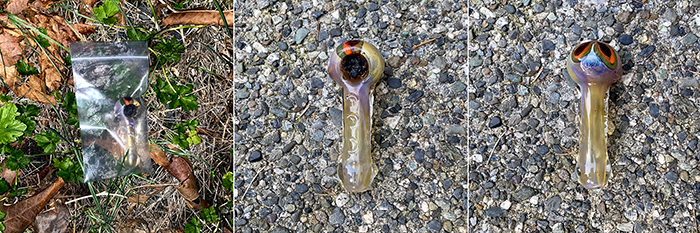 A dope pipe. We find these periodically, mostly broken. However, this person thoughtfully placed it in a plastic bag and tossed it into the soft weeds, so it was in perfect condition. It even had some product left in it. No, we didn’t try it. No matches.