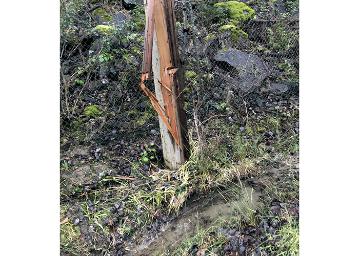 Along Riverside Drive, a telephone pole was damaged by a vehicle.