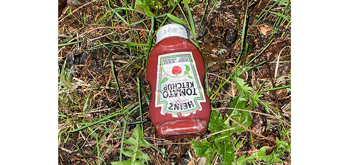 An unopened bottle of ketchup. The bottle is a little scuffed up from being tossed, but that will just add to a rugged hunting experience.