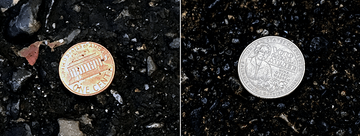 A penny at the gas station and a quarter on Simonds Road. Both were shiny and not run over. Of course, we would take them anyway. It just makes cents.