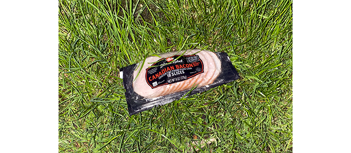 Outside the apartments on 112th Ave NE, an unopened package of Canadian Bacon.