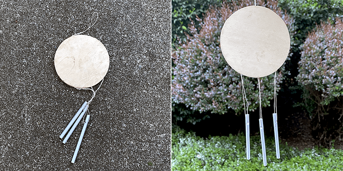 The disc is about three inches across and there’s no picture or design on it. Also, when we got it untangled, it would take a gale-force wind to get it to chime. And it didn’t chime, it kind of clanked. So, it should be called a “gale clank” not a “wind chime.” It was small, though, we’ll give it that.