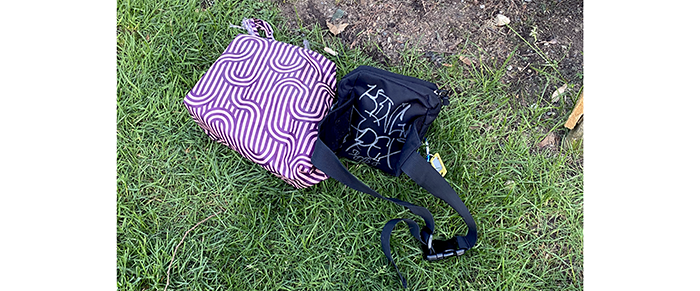 In the bushes near Safeway, someone tossed an empty cloth shopping bag and a small pack.