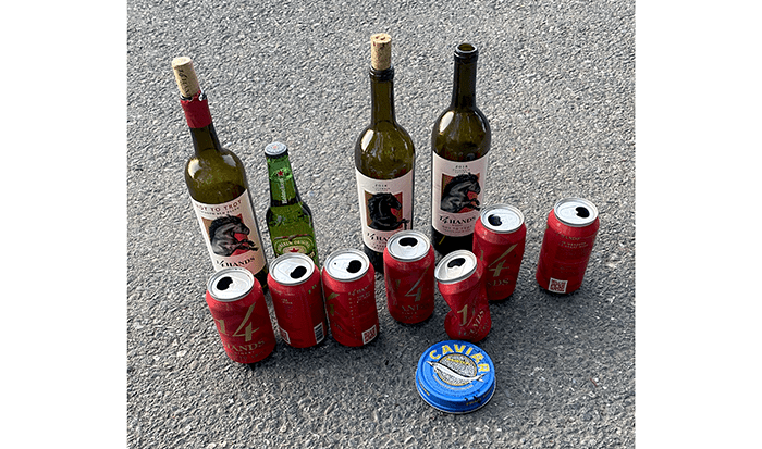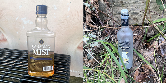 About a half bottle of Canadian Mist Whisky at a bus stop and about a third bottle of Piña Colada cocktail along the road. We could see one or the other, but not at the same time. And certainly not at 6:45 AM. Unless of course there were extenuating circumstances. Like find a $100 bill. Okay, we’ll even settle for a $50 bill.