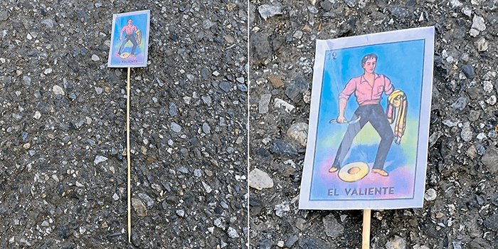 This is a card from a Bingo-like Mexican game called Lotería as explained in Wikipedia. Why the “Brave” guy is stuck on a stick, we don’t know. We played this game once at a pub in Tucson. There were four of us and we each had a beer and played one game with about thirty other participants. Chuck won the five-dollar prize which he used to pay part of the bill and left. Some folks didn’t appreciate that we won and left after one beer. Perhaps that’s how this guy ended up on a stick.