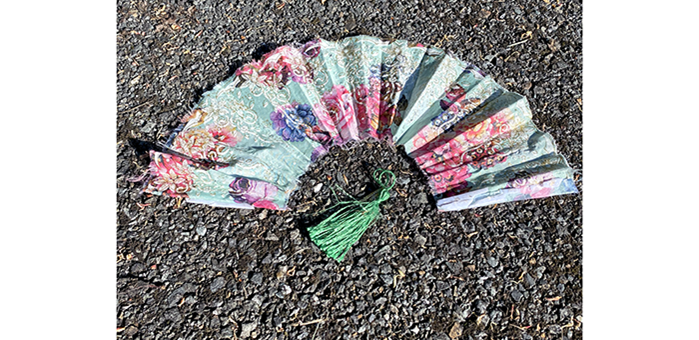 On the freeway onramp, we found a Japanese fan. Okay, we didn’t check but it was probably made in China. Only the fabric and tassel remained. No sign of the geisha, either.