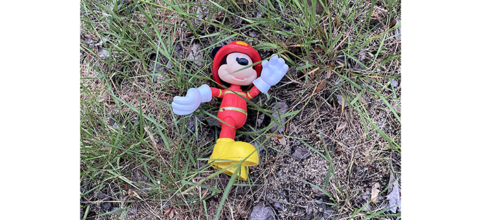 The KinderCare hoodlums tossed Fireman Mickey over the fence. At least they didn’t behead him like most of the other toys they toss over.