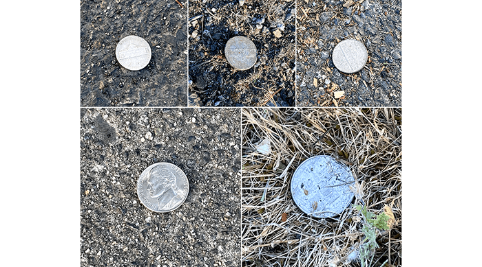 Four nickels and a quarter scattered along today’s route. We were getting worried. We are halfway through our walking week, and this is the first found money. We’ve had some weeks with very small money finds, but we haven’t been shut out since mid-January.