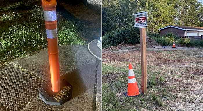 We emailed them about it and were ignored. A few weeks ago, some more construction was taking place, and we carried the Big-D pylon over to where they had stored more cones. Sure enough, when the construction ended, they took the pylon. Of course, they left two cones.