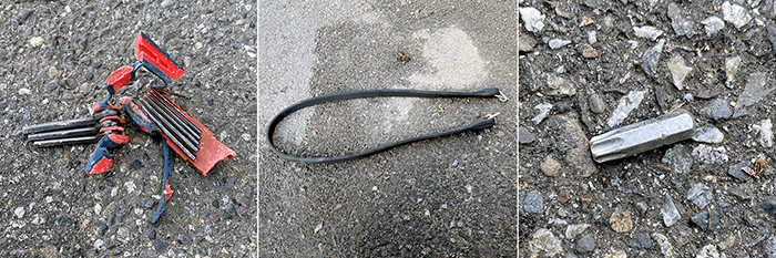 A set of hex keys and a four-foot tie-down strap both run over and in bad shape. Also, a Torx head drill bit. It’s probably also been run over, but there’s not much to damage on a drill bit.