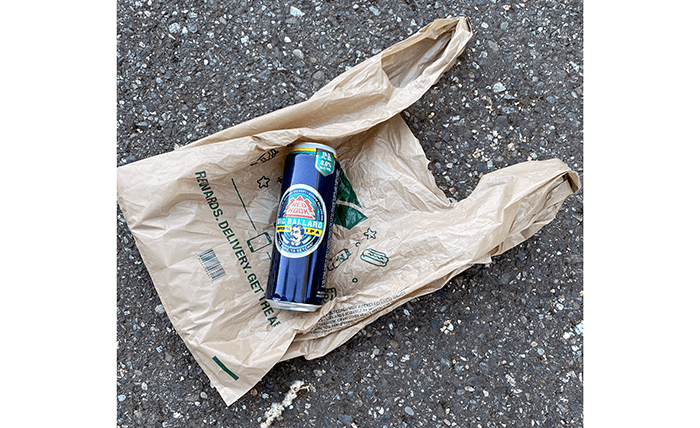 A bag with one full can of Red Hook Big Ballard double IPA, 8.6% ABV. Five cans missing and presumably empty and awaiting our attention.