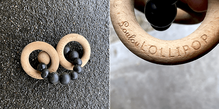 Loulou Lollipop Navy Beaded Silicon and Wood Teether. Wood? What about embedded bacteria? And splinters? And if the band breaks, those navy-blue beads will taste just like grapes. This just sounds like a bad idea. But for twenty-five bucks, it’s a good idea to someone.