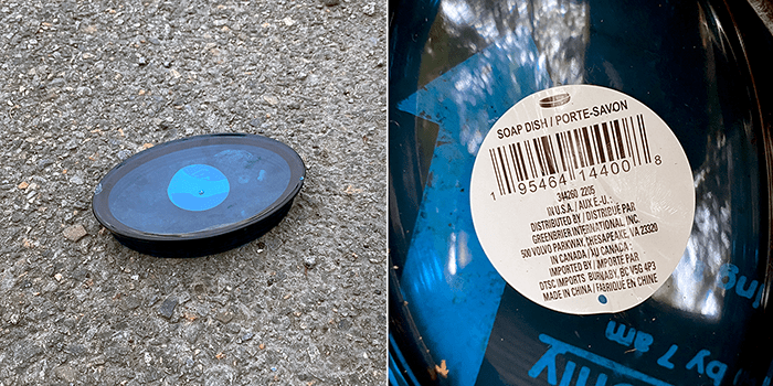 So, what was it? The label on the bottom identified it is as a new soap dish. Okay, it was plastic, new and only slightly chipped, but it could be worth something. But wait, Greenbrier International – that’s a Dollar Tree store brand. Great. Okay it might be worth a little more than a dollar, but still. We’ll stop carping, this is starting to sound like a soap opera.