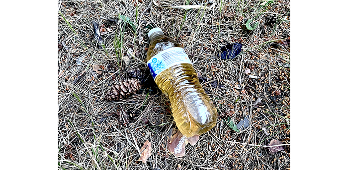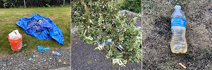 More people are using the park-and-ride as a dump. On the left was a blue tarp with what appears to be cement in it. In the middle is a bunch of tree limbs and trimmings plus a bunch of switch and outlet faceplates. Also, a urine bottle next to a large tree. Really? They use a water bottle rather than going behind a tree?