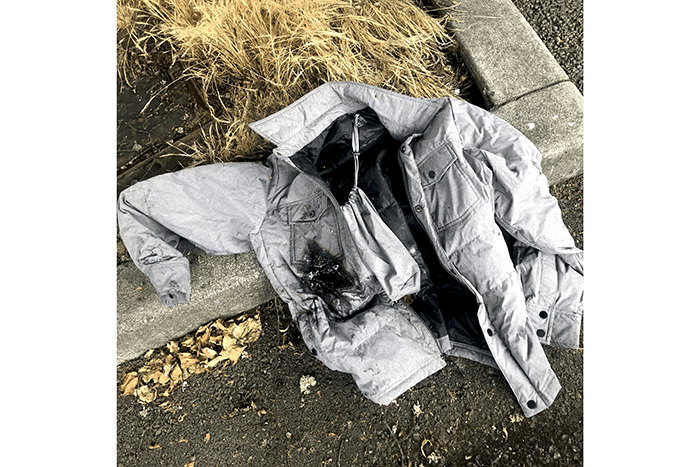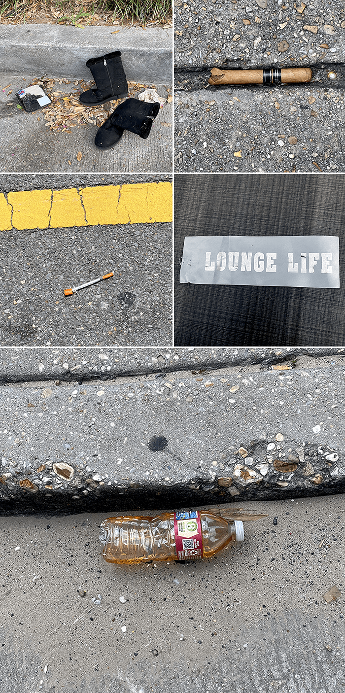 A pair of fur-lined boots. At these temperatures, we understand why they were abandoned. An unsmoked cigar and a needle. We did pick up the needle and put it in a nearby trash receptacle. A “Lounge Life” ribbon which must be a local award and, of course, a urine bottle. The bottle was near a dumpster and while we were getting ready to take the photo, two ladies walked by and asked if we were taking a picture of the dumpster. “Of course not,” we replied, “we are taking a picture of this urine bottle.” They kept walking and didn’t reply. Why would we take a picture of a dumpster anyway?