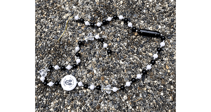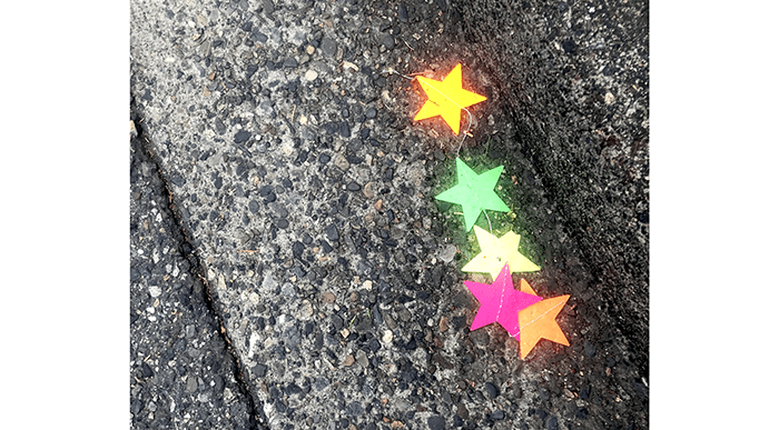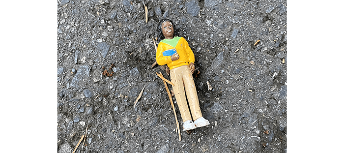 Broken glass, a hair clip, lipstick, masks, and a pin. “You are safe with me.” We obviously can’t wear this pin. We walk in the middle of streets and intersections and up freeway ramps. There’s no way you would be safe hanging out with us.