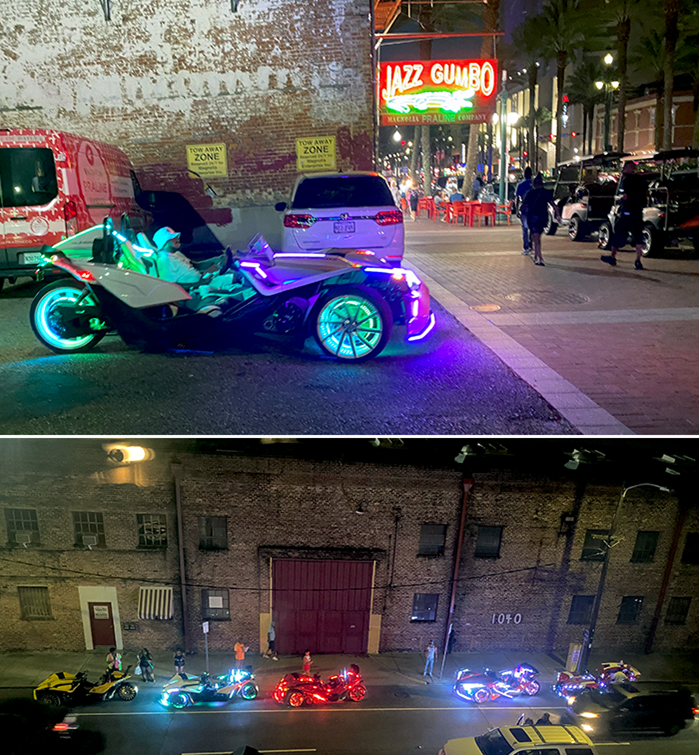 Continuing to the hotel we saw a couple of three-wheeled vehicles that were Polaris Slingshot “motorcycles.” They were lit up and blaring music through built-in speakers.
