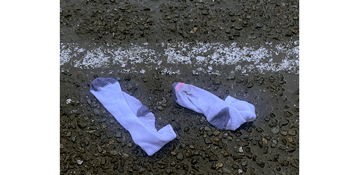 At a busy intersection, we picked up pair of toddler’s shoes. We’ll clean them up and put them in the Goodwill pile.