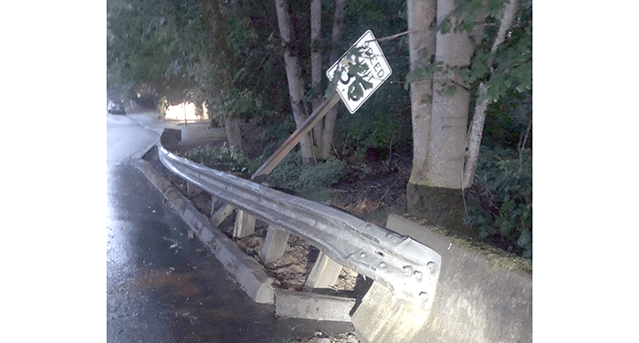 A vehicle hit the cement barrier and guard rail leaving a few car parts and taking down the sign. We’re sure the vehicle damage was much more than the sign damage cost.