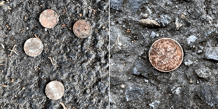 Four pennies at Janet’s favorite drive-through and another along 100th Ave. NE. This is the first money and roadkill we have found since we came back from New Orleans.