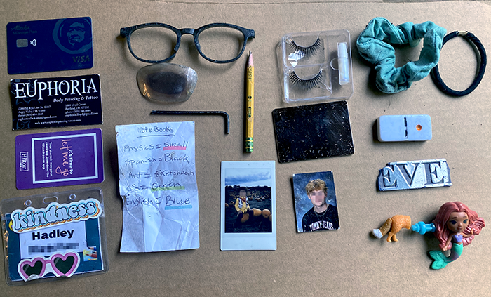 Glasses frames and a lens that does not fit the frames, an Allen wrench, a slightly run over pencil and a note indicating which notebook to use for which class.