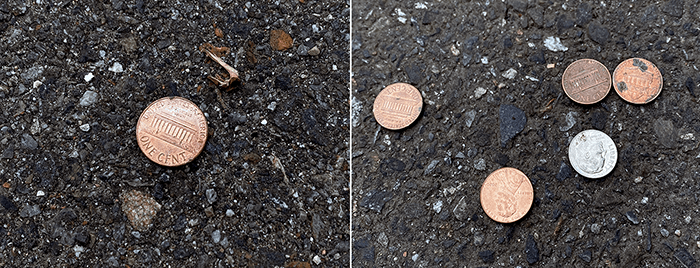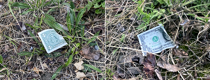 By our nature, we are always scanning the sidewalks and gutters and it paid off. We found money.