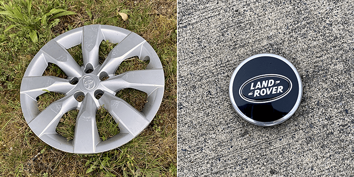 Yet another Toyota wheel cover scratched up and broken. And a pristine Land Rover hub cap. It’s a keeper. The Toyota got recycled.