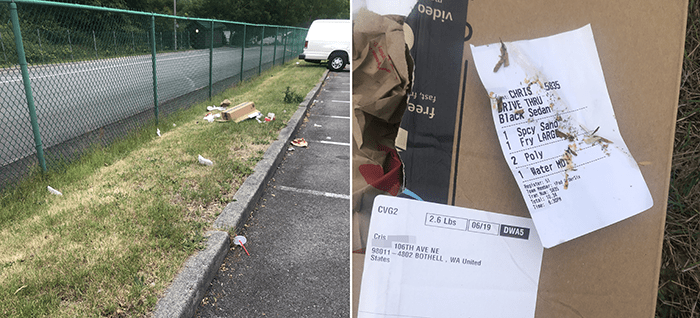 It looks like someone cleaned out his car and left another Amazon box with a name on it. Okay, it could be a stolen package, but one of the Chick-Fil-A bags had a pick-up name on it. Both the box and the tag were for Chris. So, unless someone stole Chris’ Amazon package and his dinner, this mess had to be left by Chris. We are considering placing the whole mess in the box, taping it back up, and delivering it back to Chris.